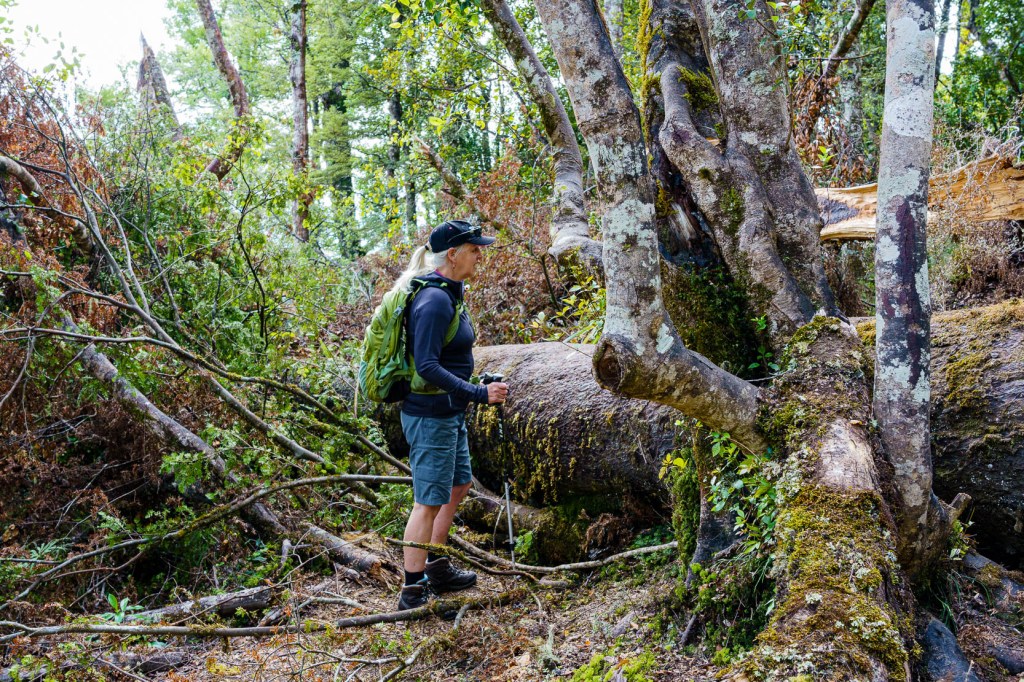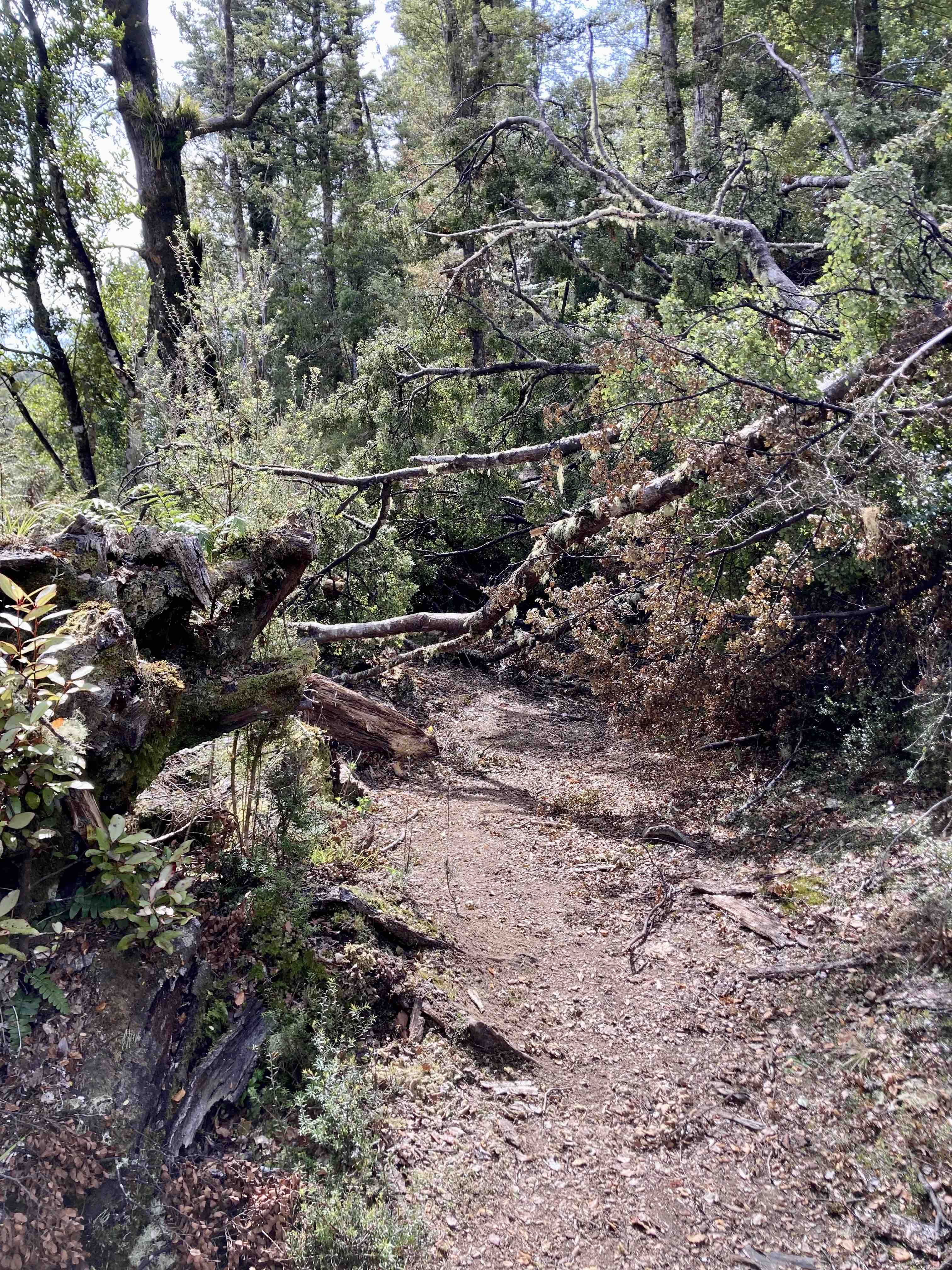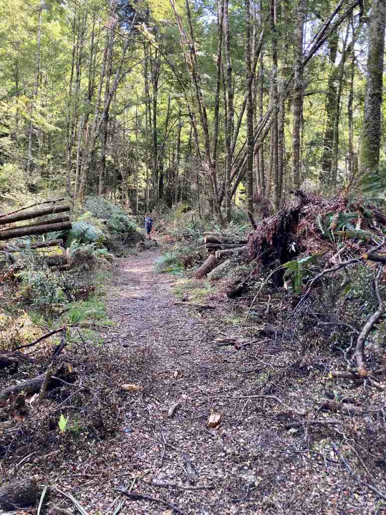 The first 500m is downhill which, apparently, is fun on a bike. Not the word in my mind as I skittle down, loose stones skittering from under my feet. Halfway down, tell-tale scatterings of sawdust suggest the work of a chainsaw and, sure enough, we soon pass through a tree, sawn-off sections of trunk to one side of the path, bare ends of branches where they met the saw the other. Half a dozen more follow in quick succession and it dawns on me that this must be the work of Gabrielle, more proof of how Ohakune was sheltered by the mountain from anything like the storm that must have caused this damage.