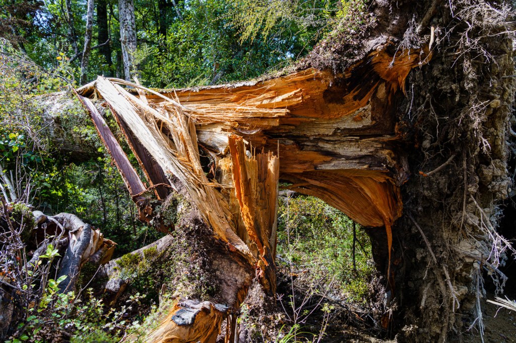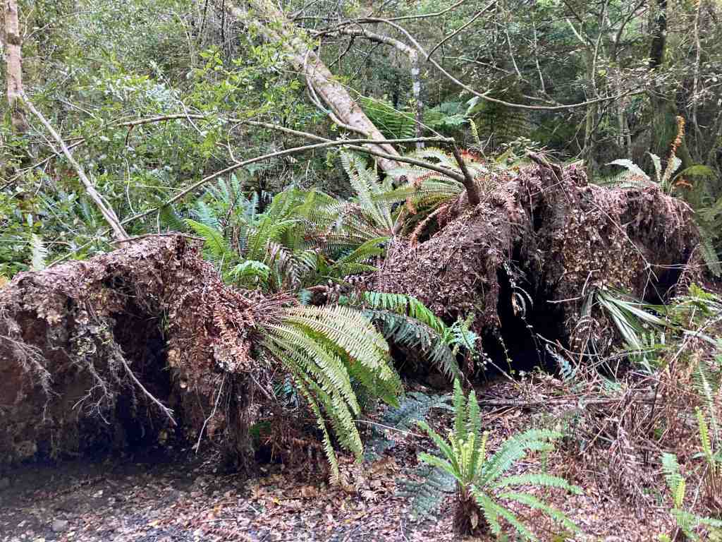 We haven’t done a decent walk for a few weeks and my legs enjoy a good stretch on the inclines, up and down, jumping across small streams. This track runs through forest, no open space, so I’m surprised when we come to an unexpected clearing. A scene of devastation greets us, with trees upended, tangled roots rising vertically over holes in the forest floor that once anchored them. A blanket of soil drapes around the base of two thin fallen trunks where intertwined roots of smaller plants have held fast, pulling a layer of earth with them. A couple of ferns cling on, their leaves hanging upside down. Sawn-off branches line the sides of the track like an honour guard. It’s a sobering sight.