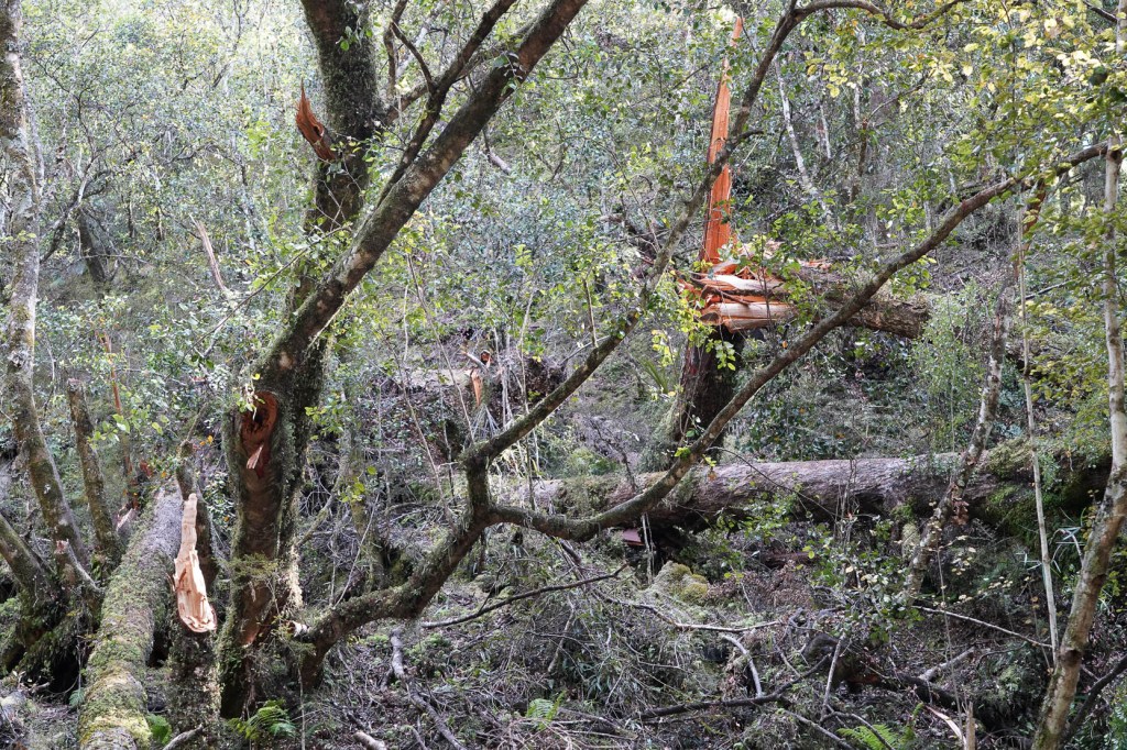 I heard someone describe the storm as like a plane landing in the back garden. It does almost seem as though a huge metal object has torn a wide path through the forest and I cannot imagine what the noise here must have been like. Terrifying springs to mind. It’s hard to comprehend the power that could cause such destruction, especially as today the forest is calm and peaceful, no wind to stir even a leaf, fantails piwakawaka-ing around us.