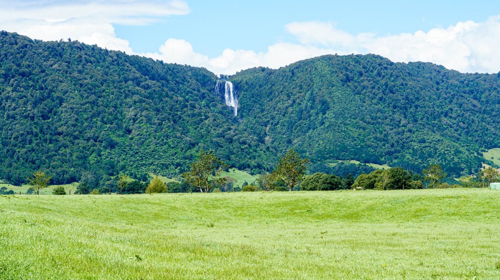 The farm on which we stay sits in a wide valley in the shadow of the Kaimai Range. The overnight rain ceases and I finally get the chance to sit outside with my morning cuppa, distant low cloud merging into the hills. With the just-risen sun above them they are a dark mass with no discernable features – even the waterfall whose white streaks glared from the green yesterday afternoon isn’t visible. The sun, sliding under the verandah roof, warms me and birds chatter, the harsh notes of the myna strange to my ears – a warm-climate bird, they don’t live where I do.
