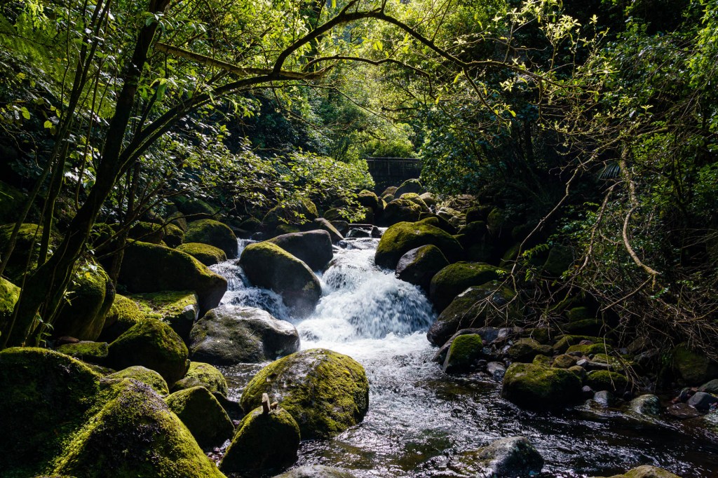 The uneven path and constant climbing make it hard going and I have to take frequent pauses to regain my breath. We twist around craggy outcrops, crisscrossing the river and climb a bit more. Wooden staircases lead over rough and steeper patches until, after an hour rather than the forty-five minutes the sign indicated, we reach a platform jutting from the rocks.