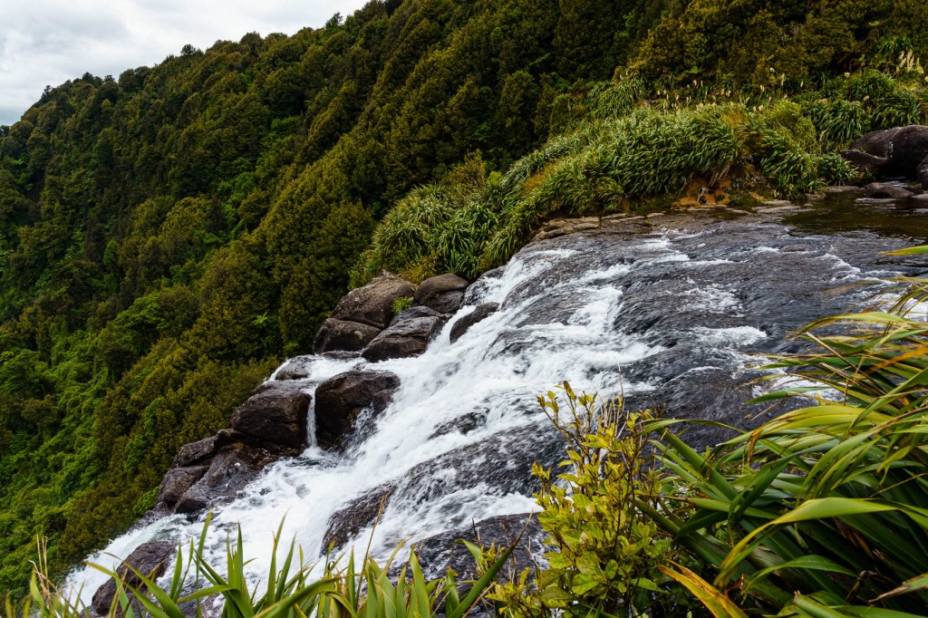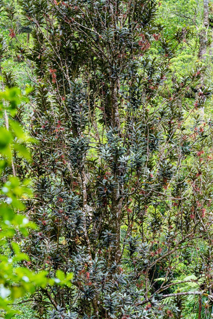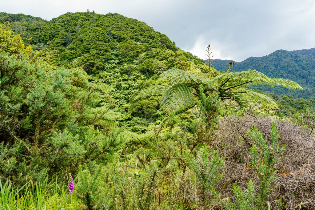 We take an easier route down, meandering through pines and natives. Despite a fresh breeze sometimes penetrating the trees it feels hot and sticky and there is water everywhere, falling beside us and streaming along the path, making it slippery on steeper sections. We turn into a small dead-end gorge, the opposite bank a proliferation of mamakus, the largest fern in the world. I’ve never seen so many in one place and walking under their umbrella leaves is like being in a green wonderland.