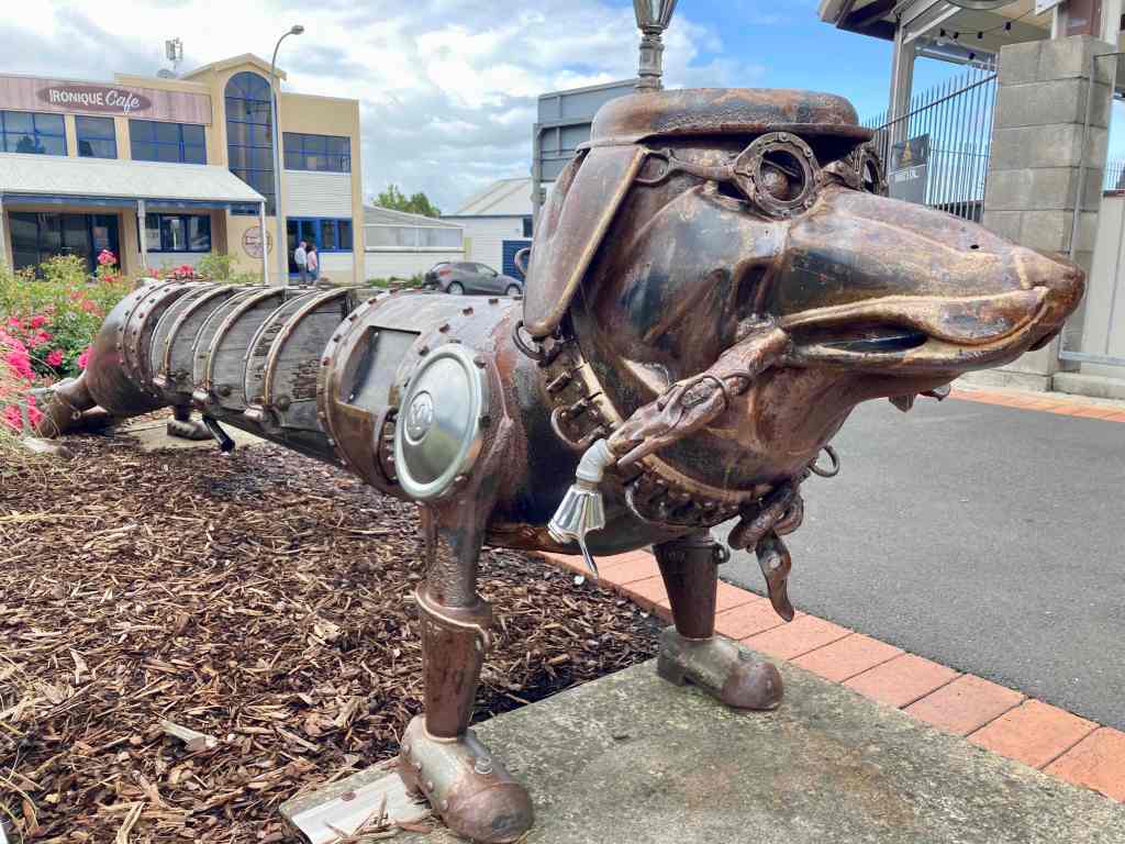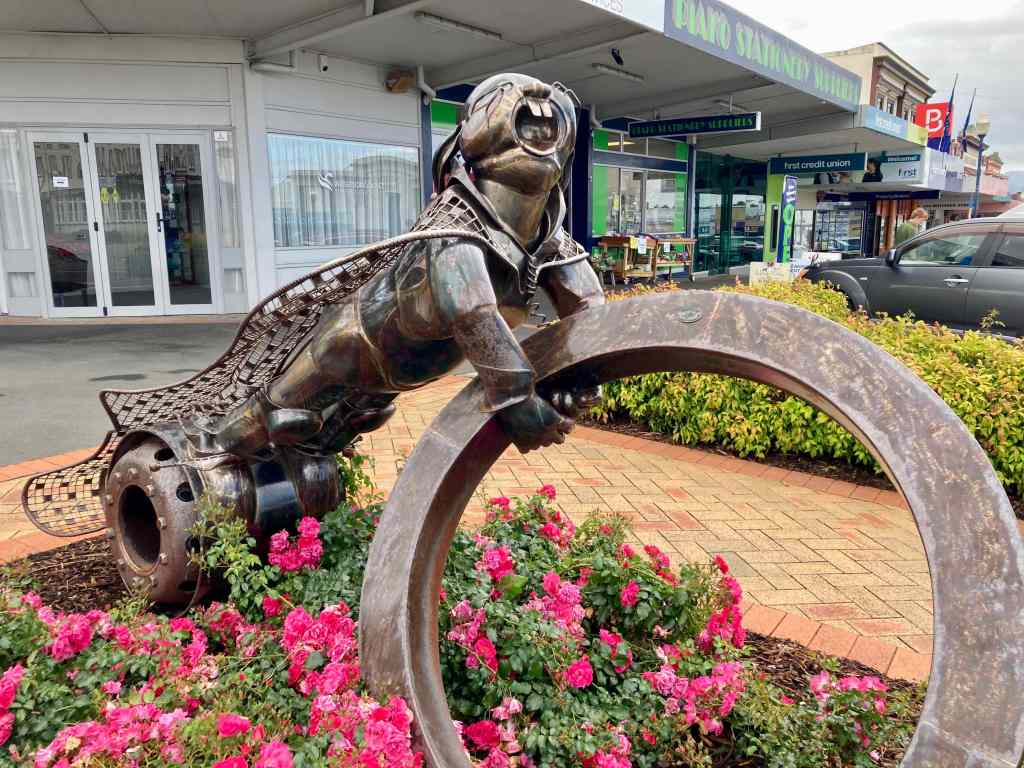 Another day, another set of squally showers, this time accompanying us to Te Aroha, a small town alongside the trail. Not sure what I expected but it wasn’t a tidy place with well-kept public areas, including a heritage precinct and some lovely parks and gardens. Sculptures made from scrap metal dot the main street, the work of a local artist, and there are a few decent cafes. The tracks of a mountain bike park climb up a hill overlooking the town and it’s worth a return visit with more time to explore. We even luck upon a book sale in the community centre.