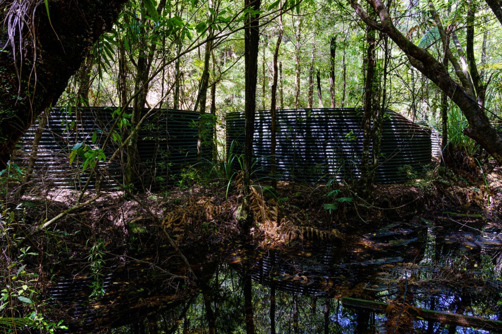 Remnants of machinery are scattered through the bush: the broken and rusted remains of a pipe that carried water to the stampers below and 10cm thick steel hawsers that were strung down and across the hillsides, from which swung ore-laden buckets. A steep side track and a fair bit of bush-whacking take us to the site of the battery, where huge corrugated iron tanks that held potassium cyanide are collapsing into the ground. A black and still pool lies menacingly between a couple, mere feet from the rushing river, but greenery sprouts all around them so surely they can no longer be contaminated.