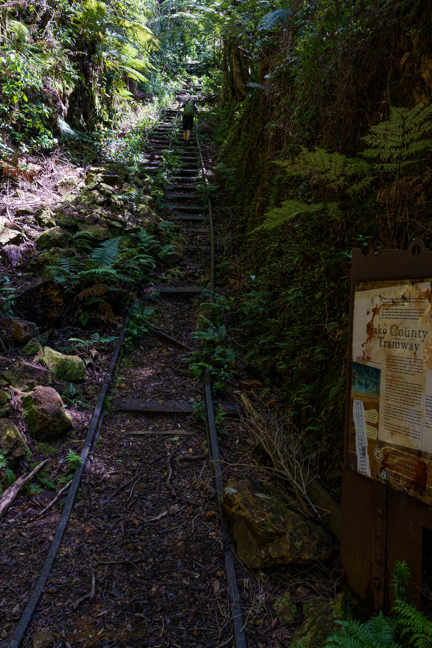 From the bottom of Butler’s Incline metal rails disappear up the hill at an angle I guess to be more than forty-five degrees. Carts full of ore were lowered down these, empty ones dragged up. The climb is steep and unremitting and feels interminable, each narrow step nearly a foot high. My hips and lower back threaten to pack up and my poles are invaluable. Even Neil finds it hard going. Finally the bush opens up and we are at the top. Looking back is vertigo-inducing.