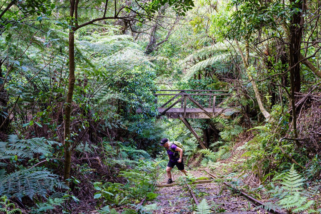 The Waiorongomai Valley in the Kaimais is another steep-sided cleft where early settlers mined for gold. An uneven track clings to the cliffside and it feels good to get our hiking boots on. Now it feels like we’re on holiday, says Neil. Sunlight filters through regenerating bush and the sound of water is constant, heavy-rain-fed waterfalls gushing across the path and towards the stream below. I jump as a runner appears behind us, his footfalls silent; I’m breathing harder than he is. Mind you, I swear his vest is the official New Zealand kit.