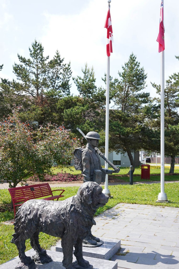 Our final stop in Gander is the nearby Heritage Memorial Park with monuments to the military aviation history of the town. A place of quiet thought and contemplation, the paths are laid out to mimic the runways of Gander Airport during WWII. A life-size statue of Sgt Gander, a Newfoundland dog who served with the Royal Rifles of Canada, stands sentinel. Sgt Gander lost his life in Hong Kong when he collected a grenade thrown by opposition forces, saving the lives of several wounded Canadian soldiers, for which he was awarded the Dickin Medal, the animal equivalent of the Victoria Cross.