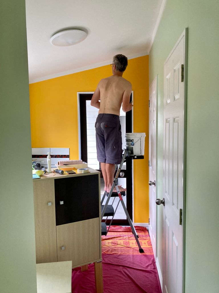 Three coats in, the walls of the bedroom didn’t look so much like a bright sunny morning as the patchwork of an average New Zealand road, and we were ready to pull the whole house down let alone try a fourth coat. Bright paints are always difficult, said a friend. Well, maybe, but this isn’t the first time we’ve got on a saddle-less horse and tried to cling on as it tried to buck us off – we’ve painted a few houses in our relationship and we’ve never gone greige, never had this problem. Even Neil, the Energiser Bunny when we began the job, was mumbling oaths as, roller in hand, he trudged repeatedly up and down the stepladder.
