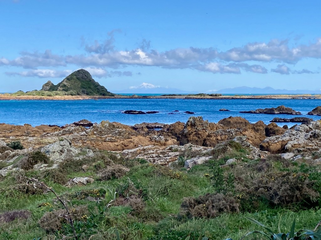 Island Bay with the snow-topped Kaikouras (South Island) behind